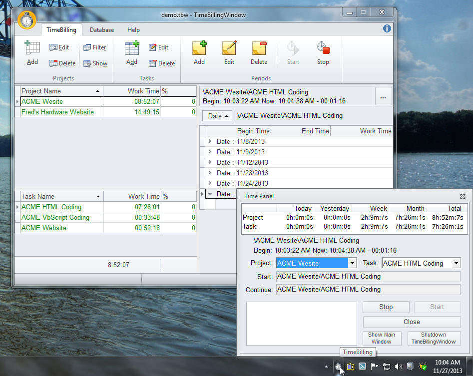 Automation with our time Billing software is the answer! The best thing about TimeBillingWindow is that it is always ready sitting in as a tray icon in the bottom corner of your screen. That means you are only a mouse movement away from logging your time as you work with clients on the phone or in the office! Starting with the time billing interface, it shows you exactly which tasks are open and being timed while collecting the time worked for fast and easy billing.