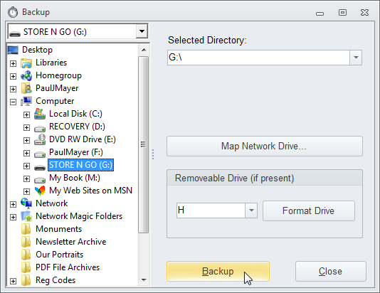 The Backup button on the Database Tab will open the Backup Dialog which is seen below. In our case we are backing up to a removable drive that we selected in the left side of the Dialog by clicking to expand the "Computer" tree and selected the G: drive. Clicking the Backup button at the bottom will backup your database.