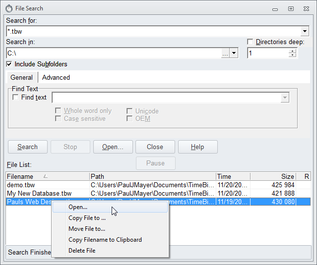 The Finder tool will allow you to locate all TimeBillingWindow databases that you may create in the future and need to find. Simply click on the Search button and it will search your hard drive. You can select the database you want and click the Open button to load it into TimeBillingWindow.