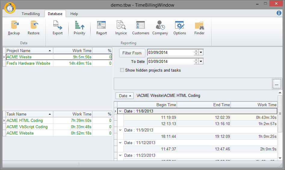 If you look at the Database Tab, you will see the buttons to Backup and Restore your database. A button to Export your Data to CSV files. A button to set the Priority labels. Buttons for Reports and Invoices, the Customer List manager, the Company settings, and Options and a Database Finder tool.