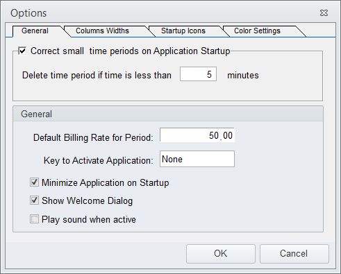 You can have the system delete small time punches on startup as you see below times under 5 minutes are deleted. You can enter the default billing rate per hour. You can set up a hot key to open the main screen, just click the entry and press the hot key combination you want such as Ctrl + Alt + T. You can set a few display items and even set it to make a sound while a timer is counting.