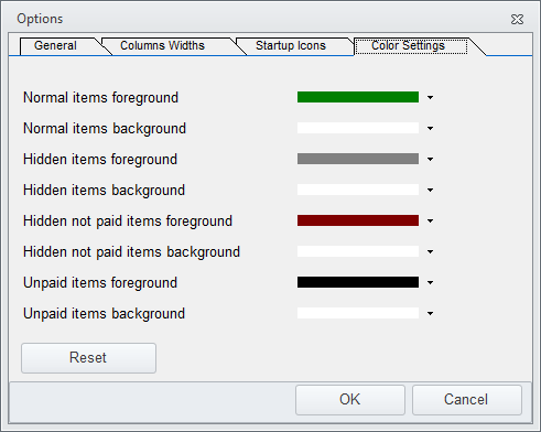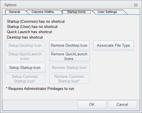 The Options button on the Database Tab opens the Options toll which has four Tabs, General, Columns Widths, Startup Icons and Color Settings.