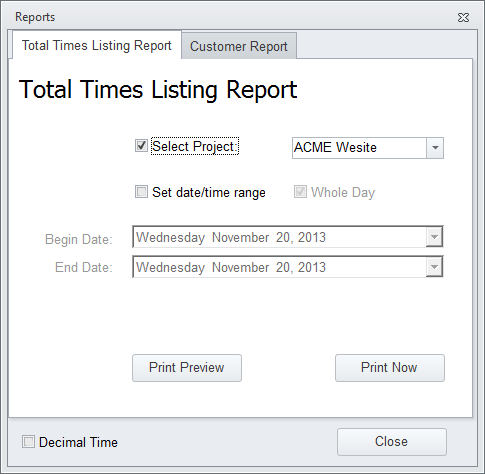 The Total Times Listing Report allows you to select a Project or even all Projects if the Select Project button is not checked and print the times for the project. You can even select a specific date or date and time range for the report.