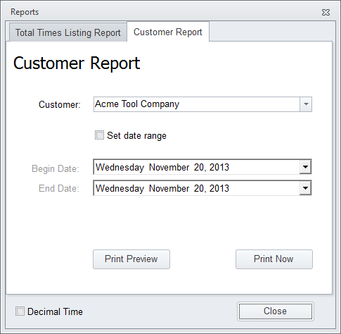The Customer Report will allow you to print the times for a Customer and also allows a date range to select from.
