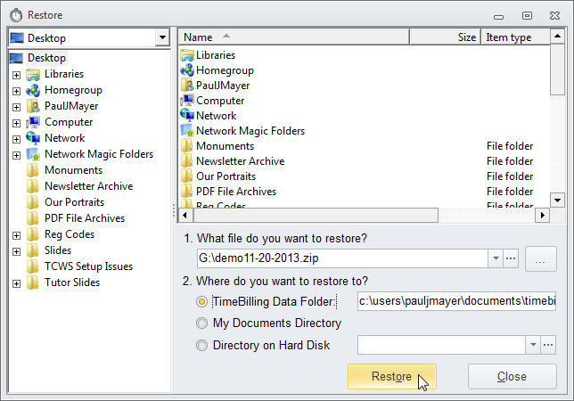 Clicking the Restore button on the Database Tab will open the File Restore Dialog as seen below. To make things easier, TimeClockWindow remembers the location and file nale last backed up for you as you see below under item 1. It also knows where it is on your computer so select the item under number 2 like seen below and click Restore.