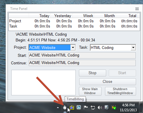 When TimeClockWindow is running, it has an Icon in the System Tray that allows use and quick access to the time tracking tools.